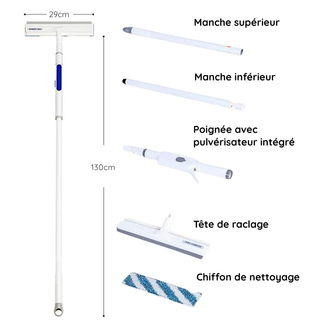 Fonctions : Pulvérisateur intégré, double face (brosse + raclette)